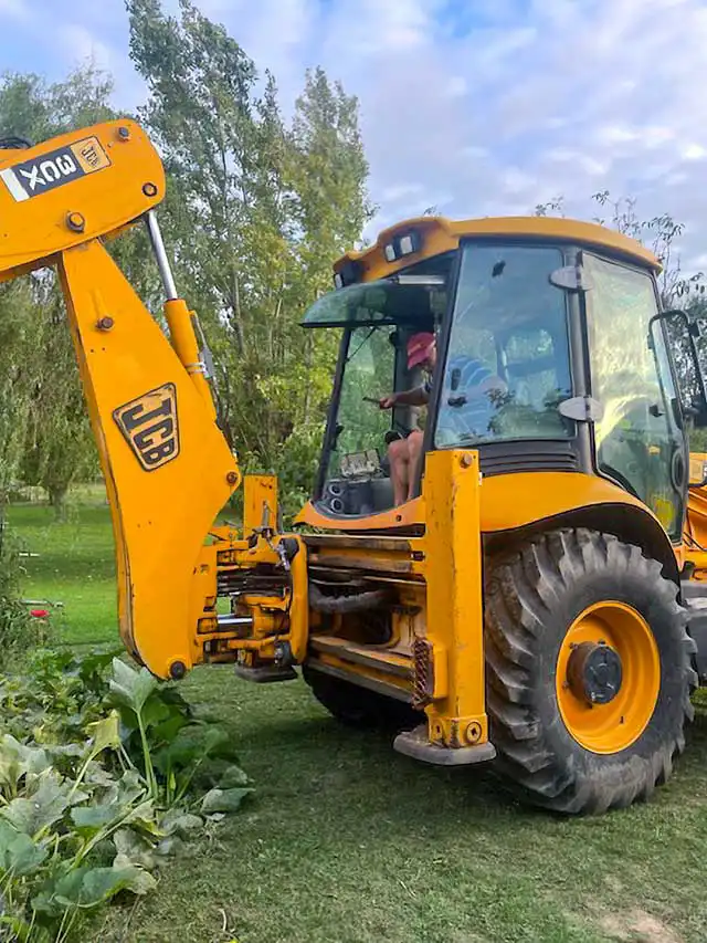 C'est un gain de temps d'utiliser le tractopelle dans ce contexte, par rapport à un montage à la main, étant donné la superficie à traiter.